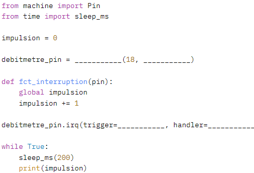 - Active l’interruption sur debitmetre_pin pour détecter les fronts montants avec Pin.IRQ_RISING.