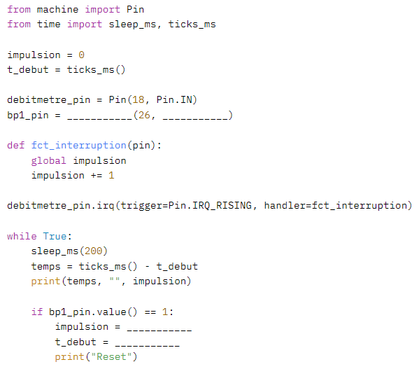 - Si oui, remets la variable impulsion à 0, réinitialise t_debut avec ticks_ms(), et affiche "Reset".