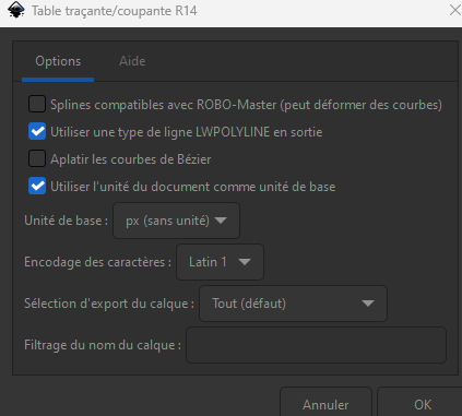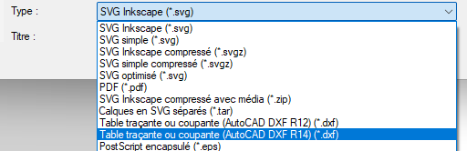 Cliquer sur le menu Fichiers puis Enregistrer sous. Choisir le Type table traçante ou coupante (AutocaAD DXF R14)