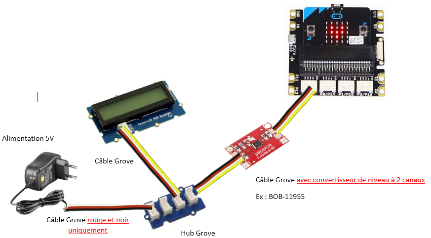 Il faut utiliser une alimentation externe 5V sur certains modules Grove car la carte Micro:bit ou l'ESP fonctionnent en 3.3V