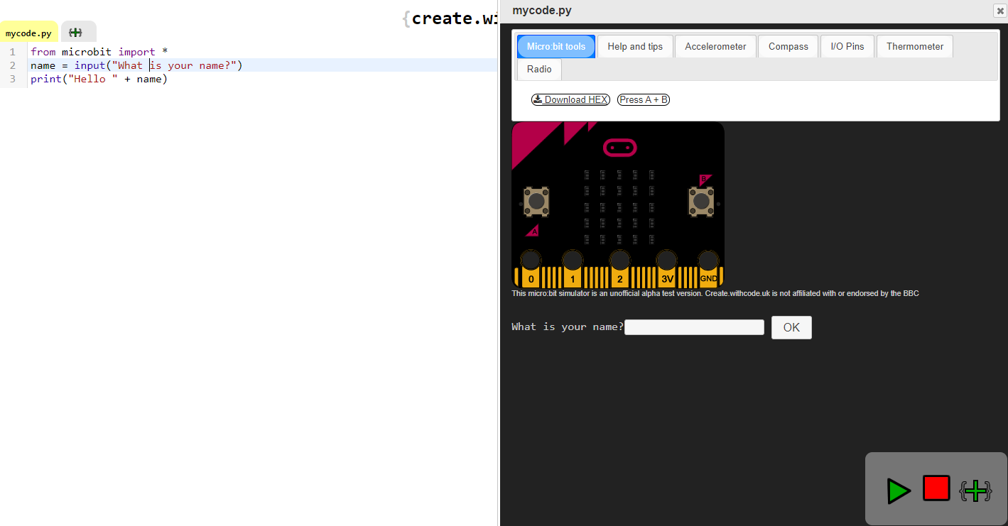 En ligne avec simulateur carte Micro:bit : https://create.withcode.uk/ |