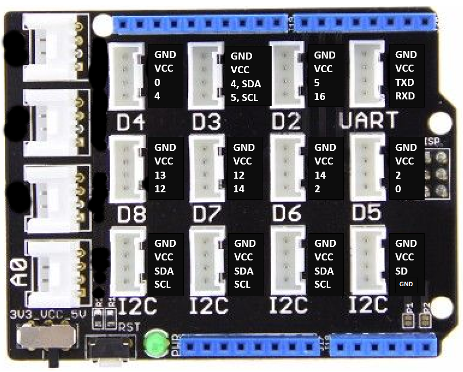 Chaque connecteur Grove comprend VCC, GND et 2 broches E/S.